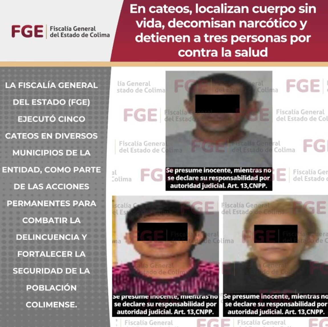 En el mismo despliegue operativo, dos hombres y una mujer fueron detenidos en distintos puntos del estado por su presunta relación con delitos contra la salud, quedando a disposición del Ministerio Público para la integración de las carpetas correspondientes.