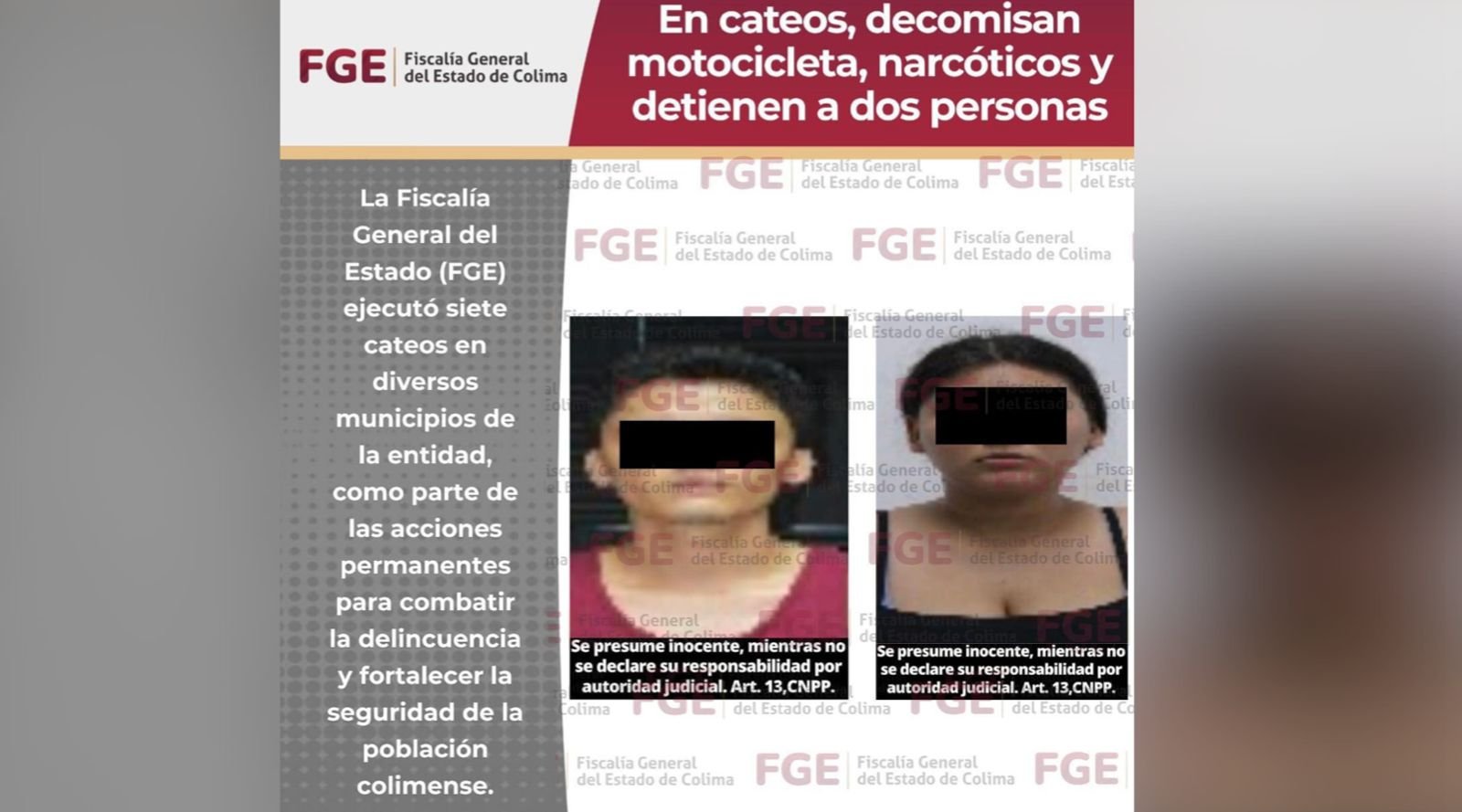 Una mujer y un hombre fueron detenidos tras una serie de operativos en los que autoridades estatales y federales aseguraron envoltorios con droga, una motocicleta y diversos indicios vinculados con actividades ilícitas en varios municipios de Colima. Ambos quedaron a…